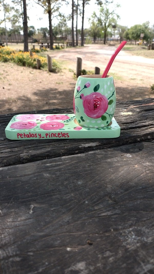 El set incluye caja pintada a mano para regalo, tarjeta día de la madre, tarjetón con curados y cuidados para el mate y la tabla.